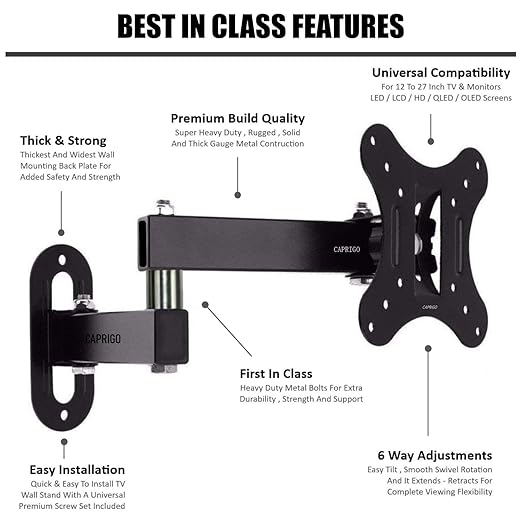 - Premium Build Quality : Premium Heavy Duty Built TV & Monitor Wall Mount Bracket With Thick Gauge Steel For Maximum Strength & Stability. Solid & Robust Construction Offering A Superior & Sturdy Wall Mounting Solution. Built By A Team Of Wall Mounting Experts At Caprigo, Making It Durable With A Long Lasting Performance. Heavy Duty Metal Wall Mount With Increased Thickness To Hold The Weight Of Youโre Premium TV/Monitor Effortlessly