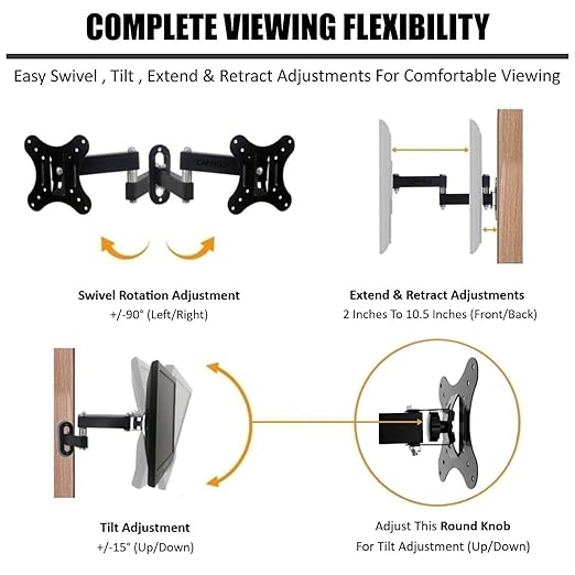 - Complete Viewing Flexibility : Six Way Full Motion Adjustable TV/Monitor Mount Having The Following Specifications – Tilt : +/- 15ยฐ (Up / Down) | Swivel Rotation : +/- 90ยฐ (Left / Right) | Maximum Distance From Wall When Extended : 10.5 inch | Minimum Distance From Wall When Retracted : 2 inch