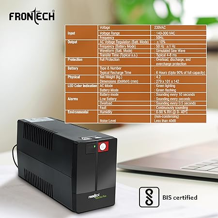 Be the first to review “FRONTECH UPS Electra Plus 600VA/360W, Uninterrupted Power Supply System, Maintenance Free Battery, LED Indicator, Power Backup & Protection for Home/Office PC, Desktop and Other Electronics, (2564)”
