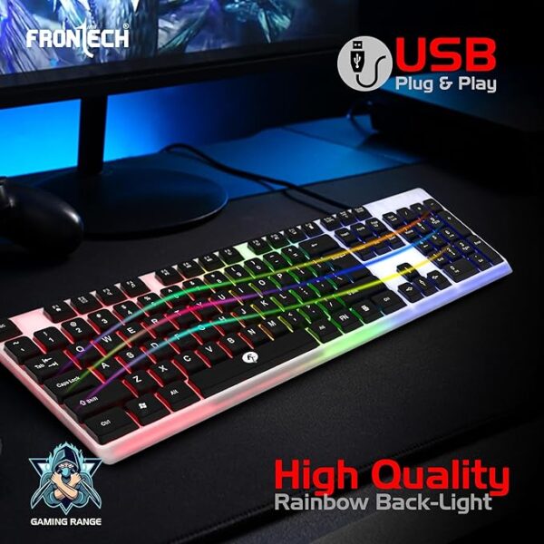 FRONTECH Wired Gaming Keyboard with 104 Keys | Rainbow Backlight Effect | Membrane Keys with Retractable Stands | USB Plug & Play | Ergonomic Design | Easy to Use (KB-0042, White & Black)