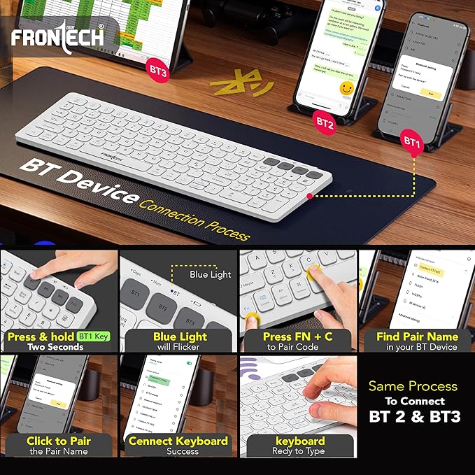 - Dual-Mode Connectivity Effortlessly switch between a 2.4 GHz USB-C nano receiver and Bluetooth 5.0. Pair up to three Bluetooth devices (BT1, BT2, BT3) or your computer via 2.4 GHz at the flip of a switch for ultimate multitasking.