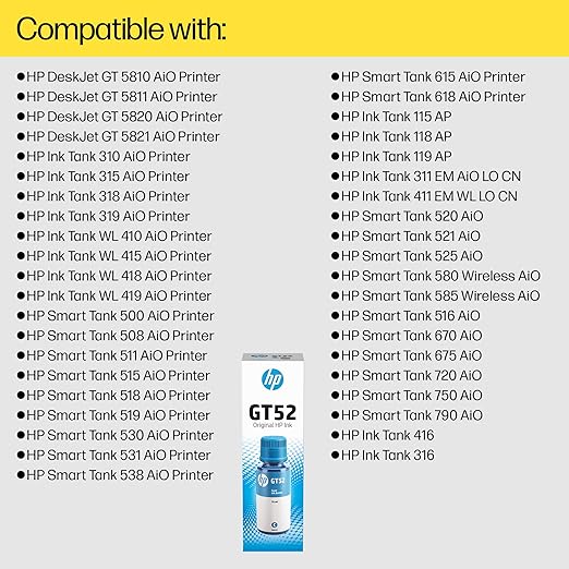 • Compatible with Printers-HP DeskJet GT 5810 All-in-One Printer,HP DeskJet GT 5820 AiO Printer,HP DeskJet GT 5811 AiO Printer,HP DeskJet GT 5821 AiO Printer,HP Ink Tank WL 415 AiO Printer,HP Ink Tank WL 418 AiO Printer,HP Ink Tank 315 AiO Printer,HP Ink Tank 318