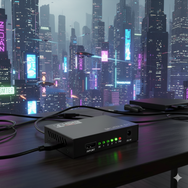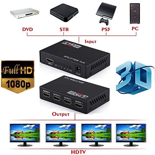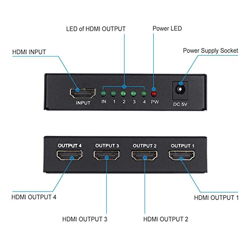 - HDMI SPLITTER 1 IN 4 OUT – The HDMI splitter distributes video and audio signal form 1 HDMI source to 4 HDMI displays simultaneously.