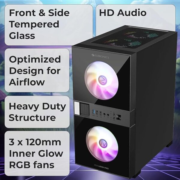 Be the first to review “ZEBRONICS Leon PRO Premium Gaming Cabinet/Case, Mini-Tower, Supports mATX | ITX, 3 Pre-Installed RGB Fans, Side Tempered Glass”
